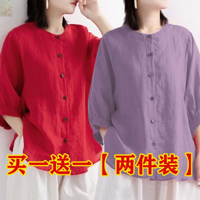 若柠服饰高品质大码宽松棉麻七分袖衬衫女灯笼袖上衣亚麻衬衫妈妈热门设计联盟服务商