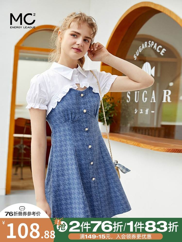 2021年夏季腰件新款格子拼接泡泡袖连衣裙女设计感小众收假两裙子热门设计联盟服务商