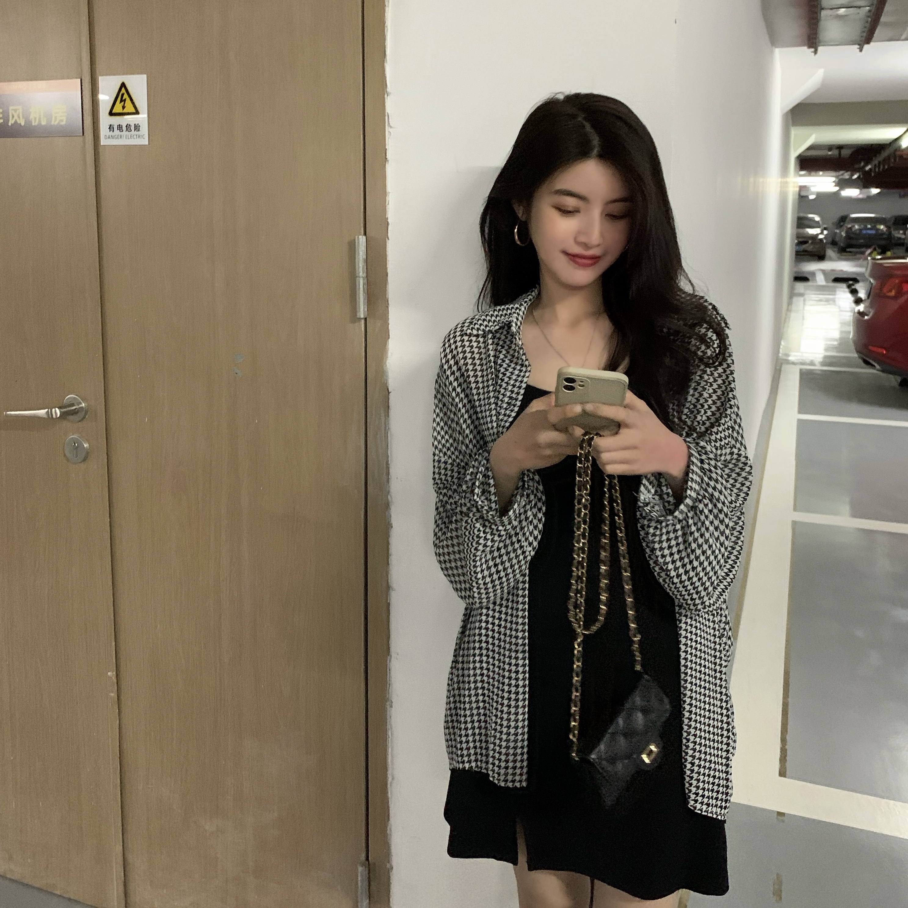 2021年秋季精品黑色开叉显瘦吊带裙+千鸟格设计感衬衫套装热门设计联盟服务商
