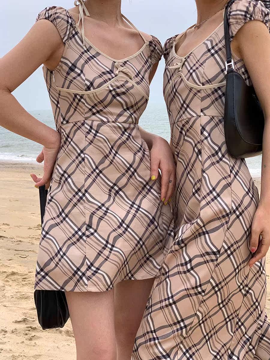 外到了性复古格纹连衣卖裙女小众设计感绑带感收腰显瘦长短闺蜜裙热门设计联盟服务商