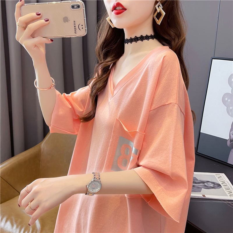 棉盐系口袋设计感大码V领短袖T恤女夏季韩版学生宽松遮肚ins上衣热门设计联盟服务商